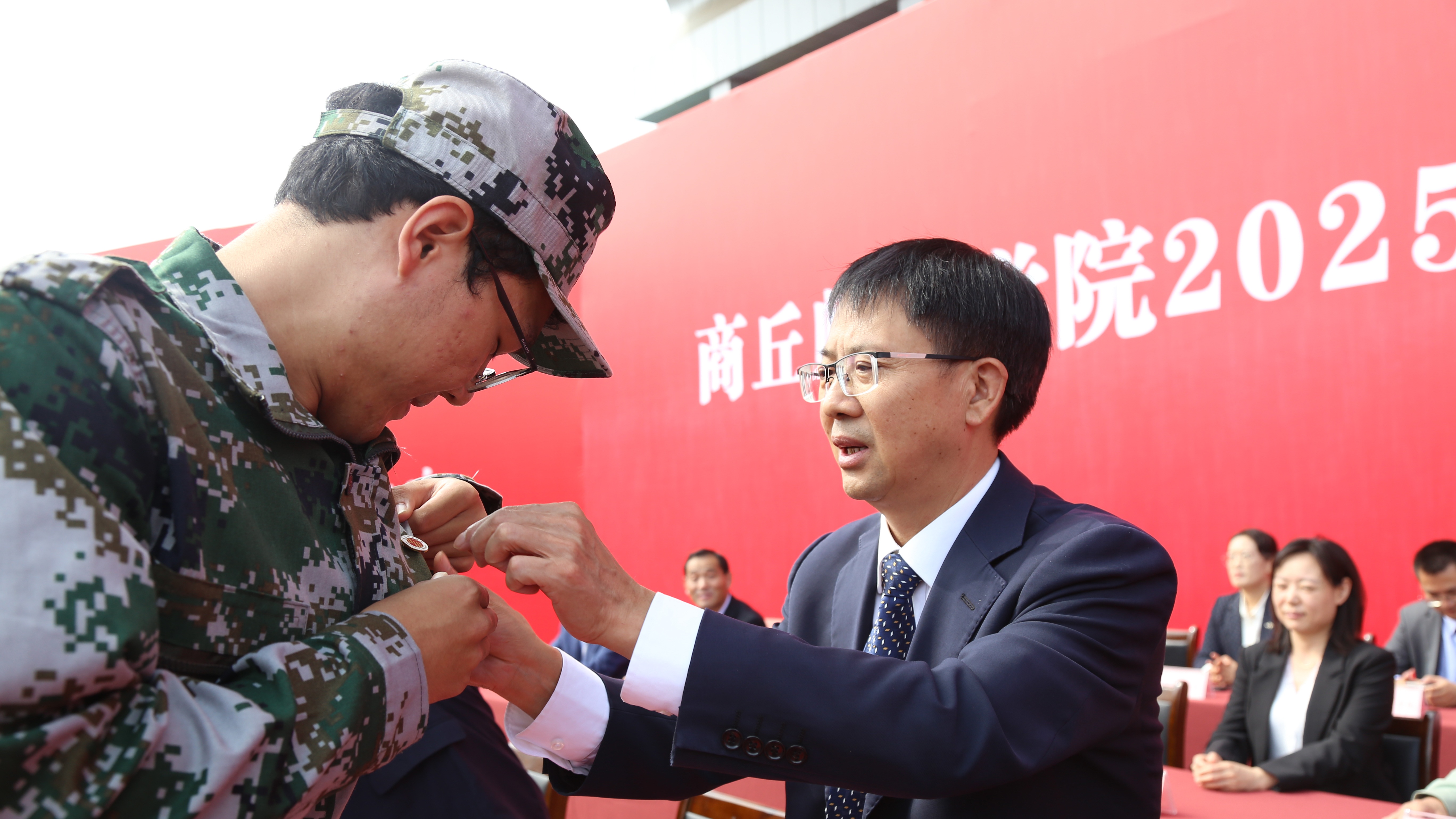 校党委书记张尚字等全体校领导为2025级新生代表佩戴校徽,并表示祝贺。