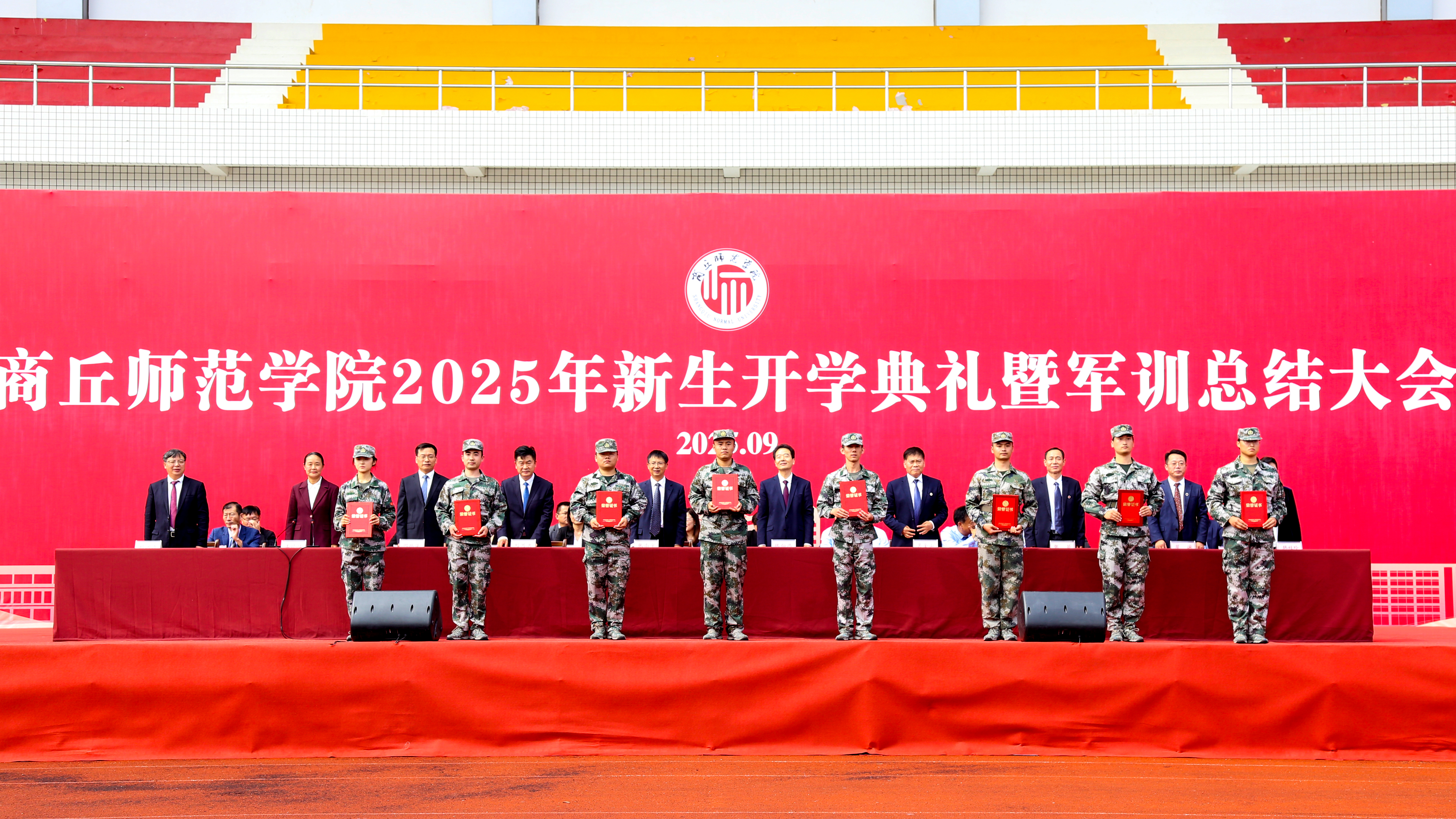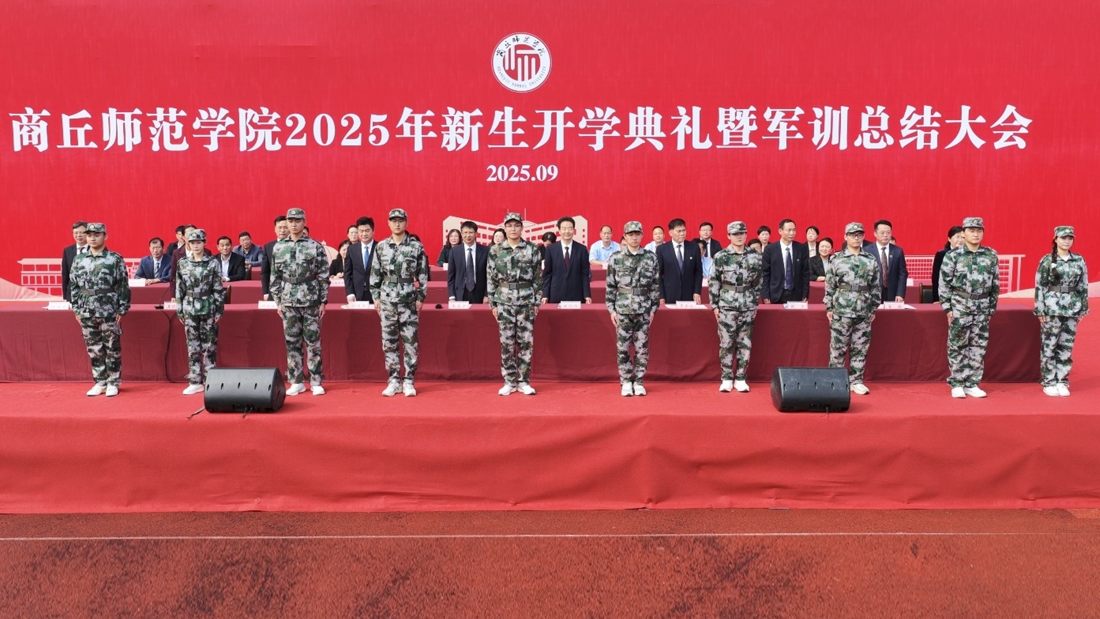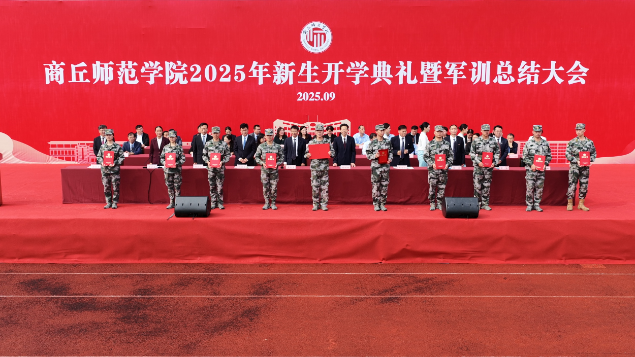9月29日,商丘师范学院在梁园校区体育场举行2025级新生开学典礼暨军训总结大会。校领导张尚字、陈向炜、刘国庚、吴金山、何瑞强、张箭、王晓征、翟滨、刘澜涛、韩桂玲出席。校直有关部门和各学院负责人、2025级辅导员老师、教师代表和学生代表共同参加了活动。